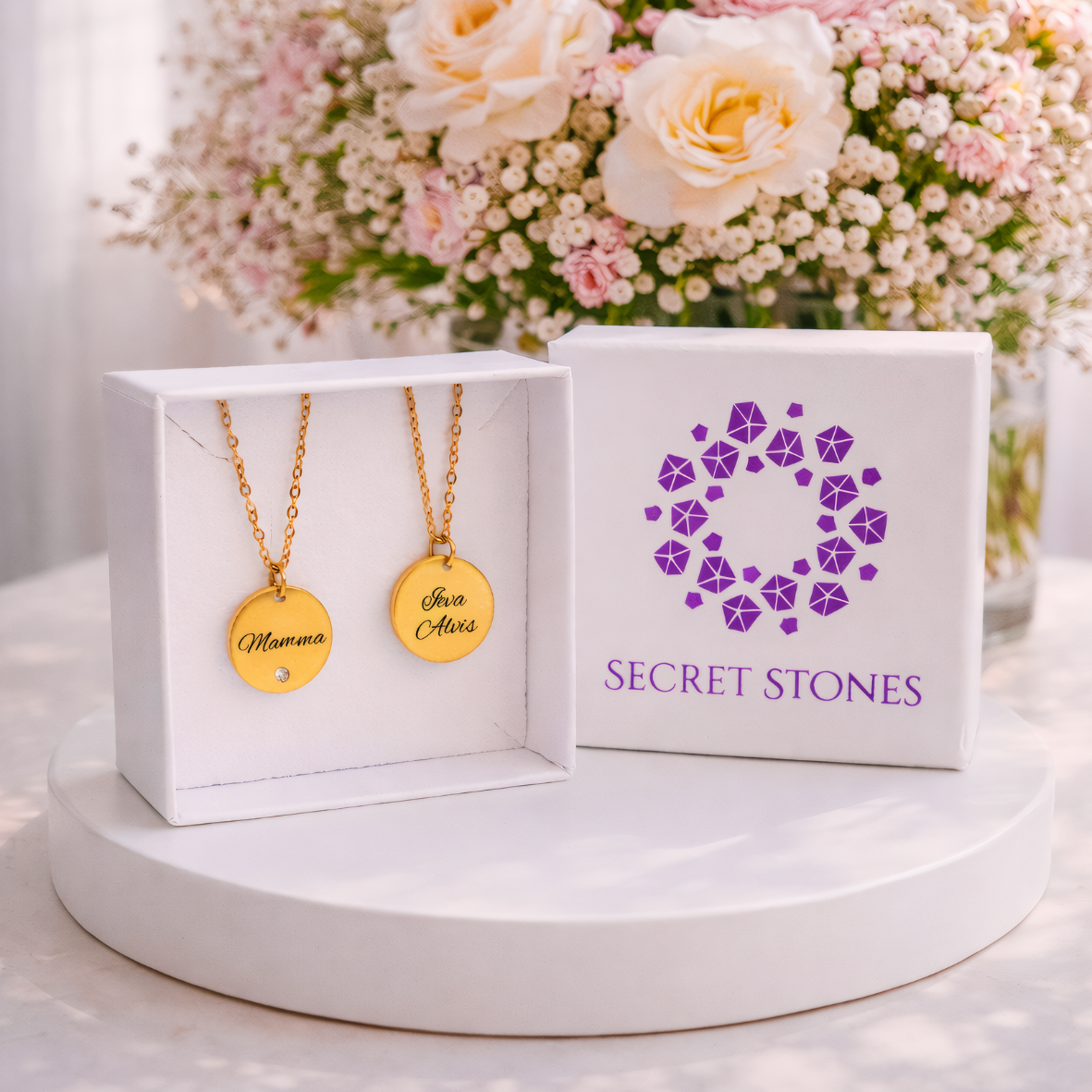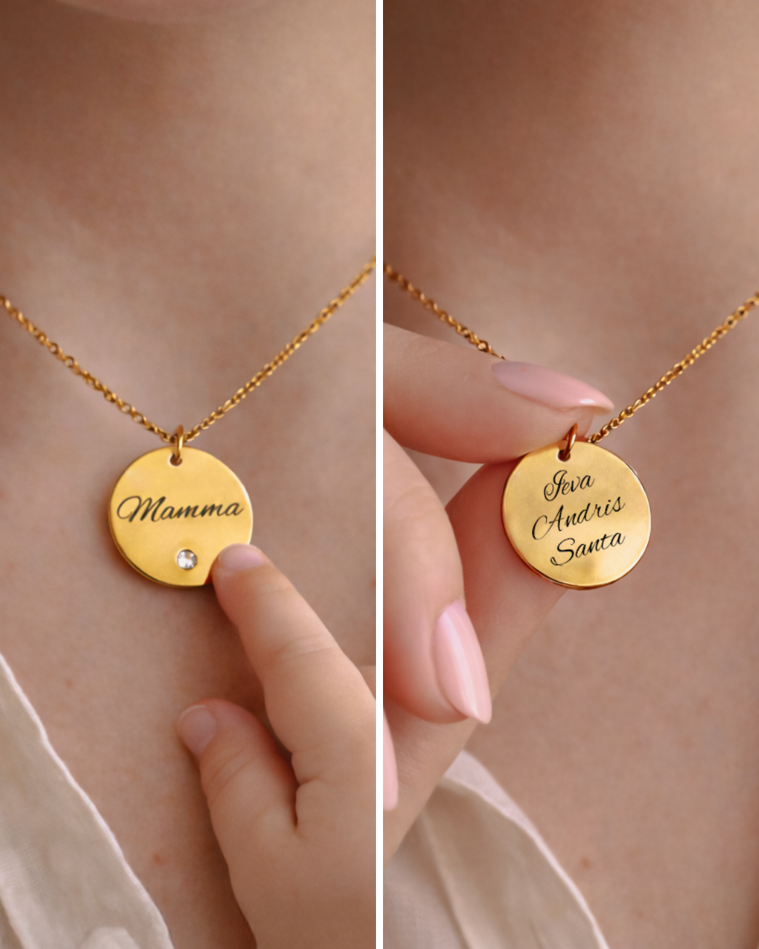 dāvana mātes dienā kaklarota ar apaļo kulonu un gravējumu Mamma un bērnu vārdiem