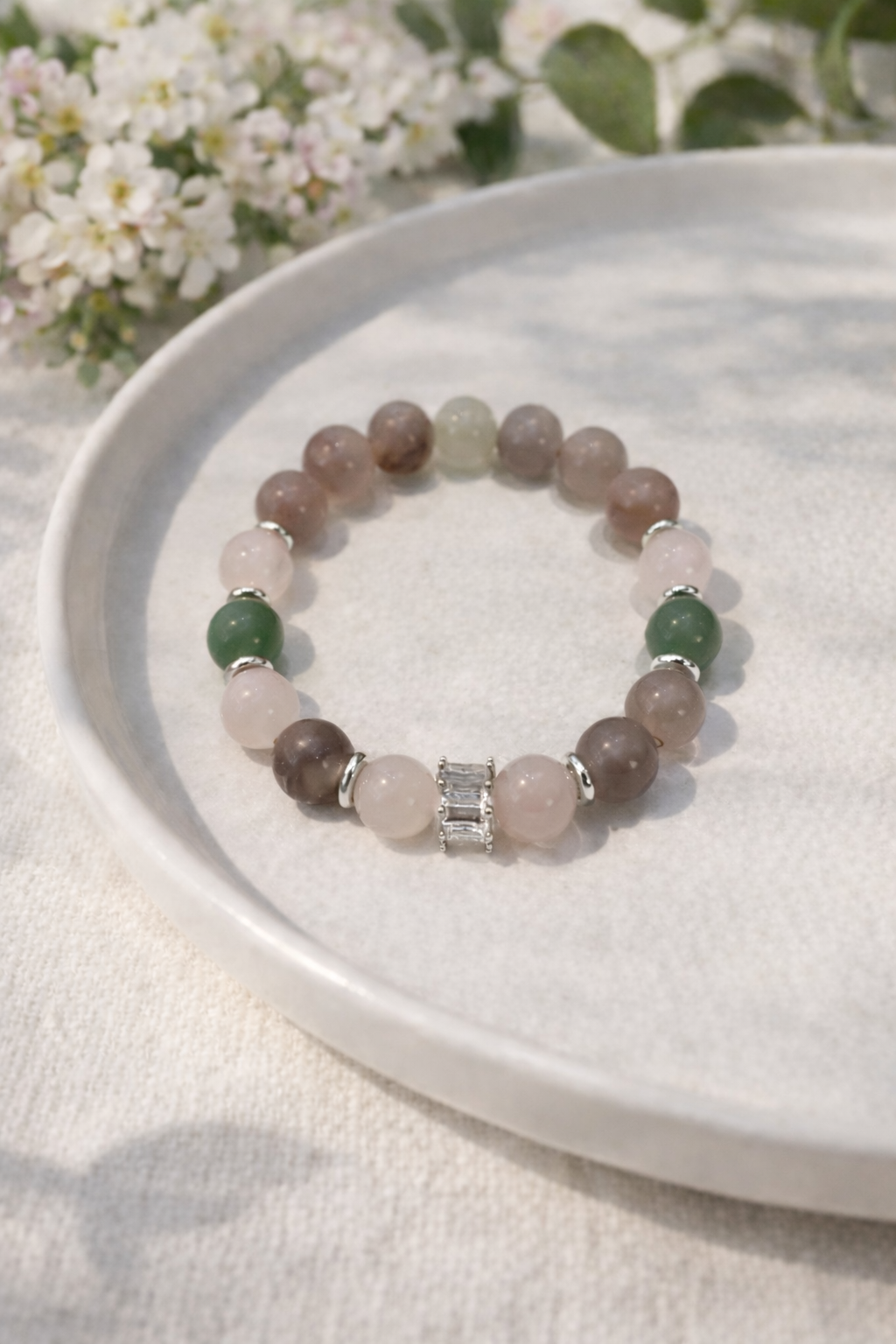 brūnā ahāta, rozā kvarca un zaļā avanturīna rokassprādze ar  sudraba krāsas elementiem.