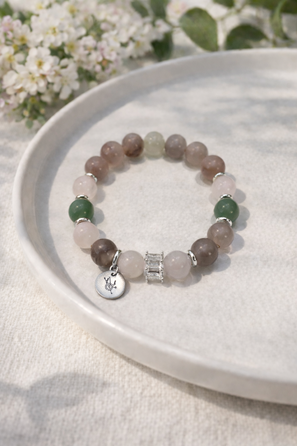 Horoskopa rokassprādze Vērsim ar bēšo ahātu, rozā kvarcu un avanturīnu ir radīta stabilai, sievišķīgai un vērtību apzinīgai personībai.