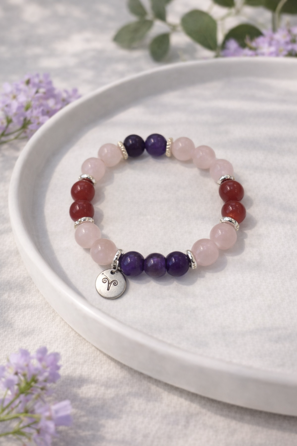 Horoskopa rokassprādze Aunam ar rozā kvarcu, karneolu un ametistu ir radīta drosmīgai, enerģiskai un kaislīgai personībai.