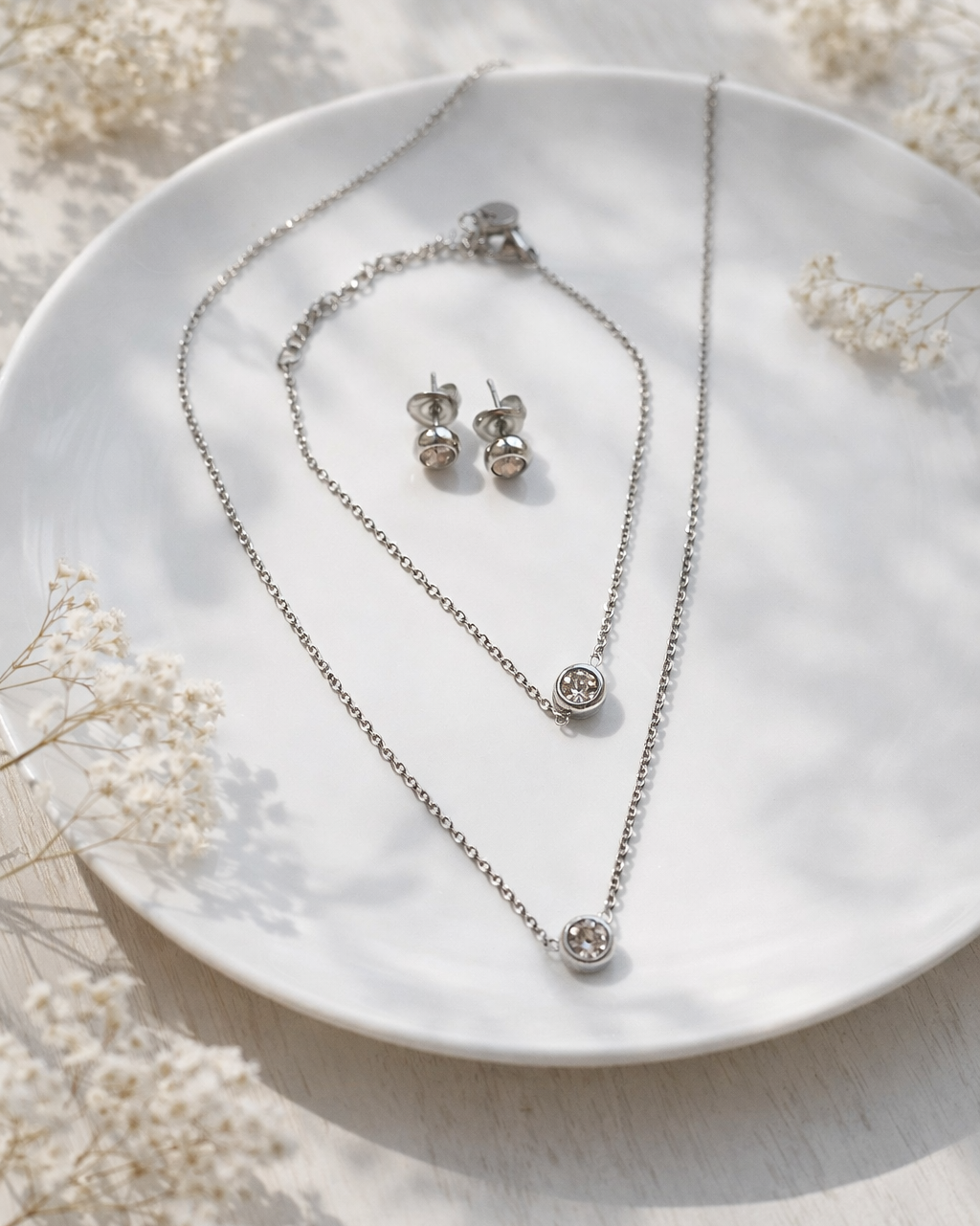 - Rotu komplekts sudraba krāsā - auskari, rokassprādze un kaklarota.