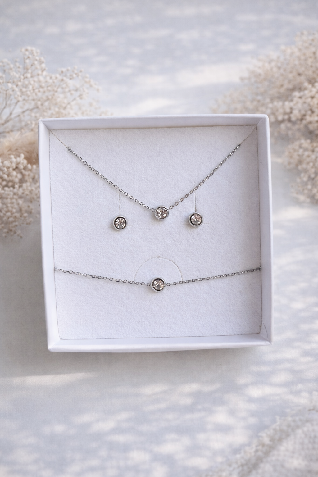 Elegants, skaists un ļoti gaumīgs komplekts. Auskari, kaklarota un rokassprādze lieliski piestāvēs tavām ikdienas gaitām, kā arī īpašiem mirkļiem.