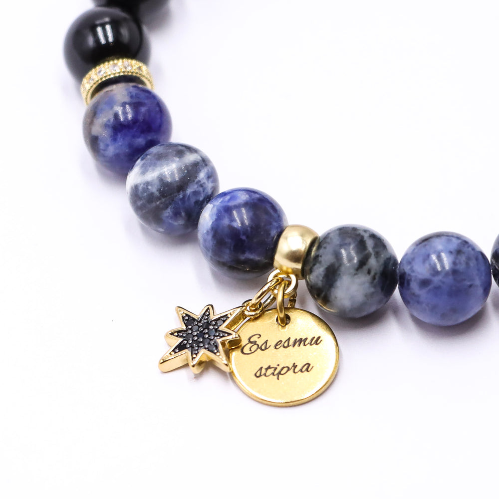 Šai rokassprādzei tika izvēlēts sodalīts un onikss - divi ļoti spēcīgi akmeņi, kas tavu apņemšanos nostiprinās.