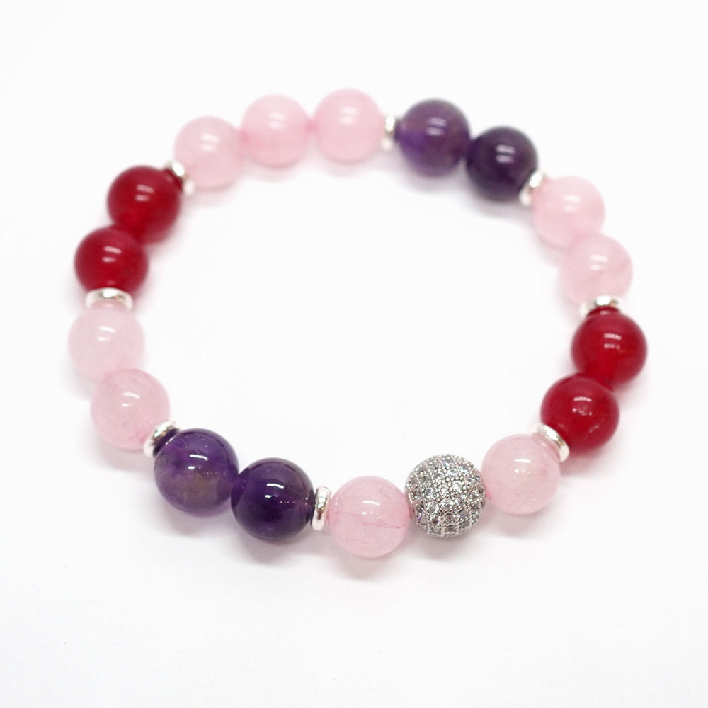 Lauvas spēks un sirds – rokassprādze ar ametistu, sarkano žadeītu un rozā kvarcu