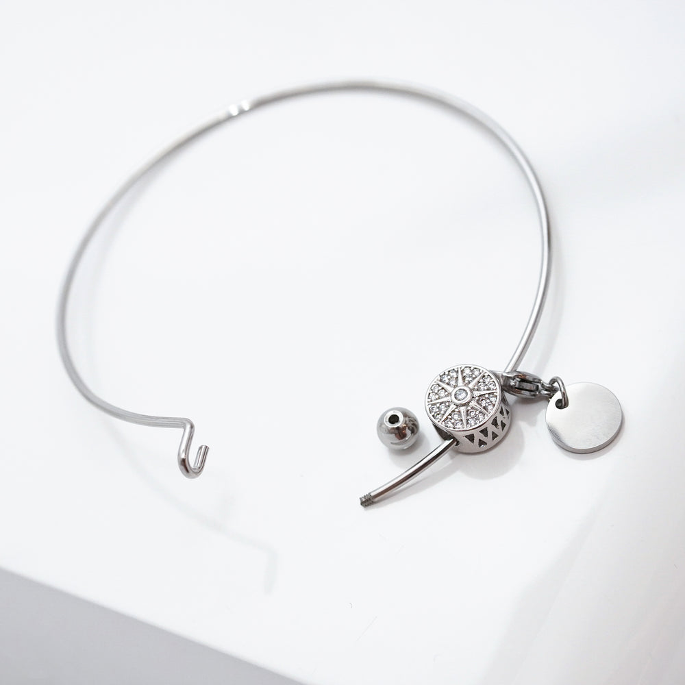 Šī elegantā rokassprādze ir kā radīta Tavai radošajai brīvībai – tā pielāgojas Tavām sajūtām, mirkļiem un noskaņām. Galā iestrādāta skrūvējama bumbiņa, kuru vari viegli atskrūvēt, lai pievienotu savus mīļākos piekariņus – kādus vēlies vai pievienot medaljonu ar gravējumu! Cik un kādi būs piekariņu uz tavas rokassprādzes Tu izvēlēsies pati.