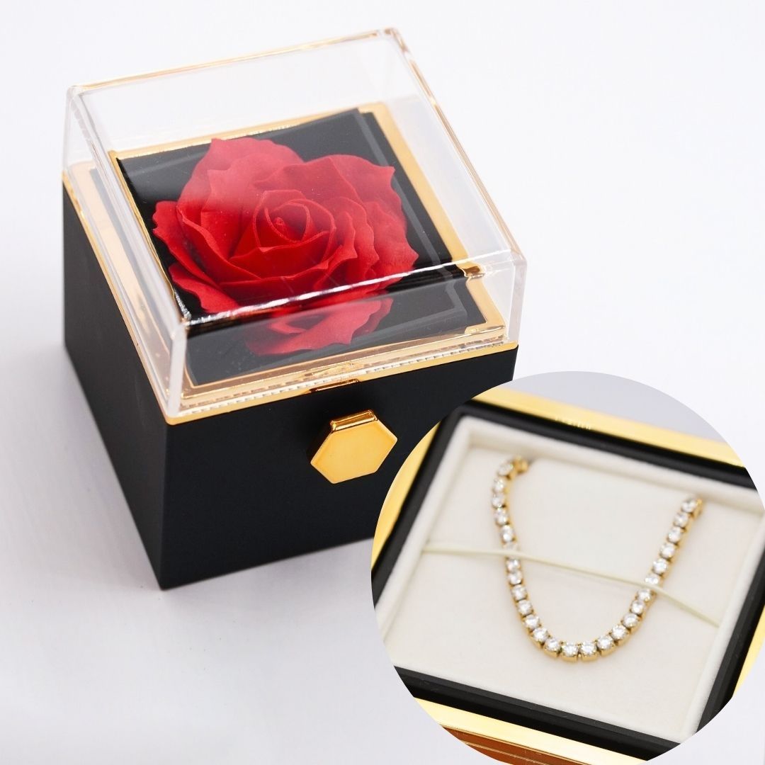 Dāvanu kastīte ar Mūžīgo rozi un tenisa rokassprādze- šī elegantā dāvanu kastīte apvieno luksusa dizainu un simbolisku nozīmi. Tajā atrodas Mūžīgā roze, kas simbolizē mūžīgu mīlestību un skaistumu, un smalka kaklarota, kas padarīs dāvanu īpaši personīgu. Ideāla Mīlestības dienas dāvana.