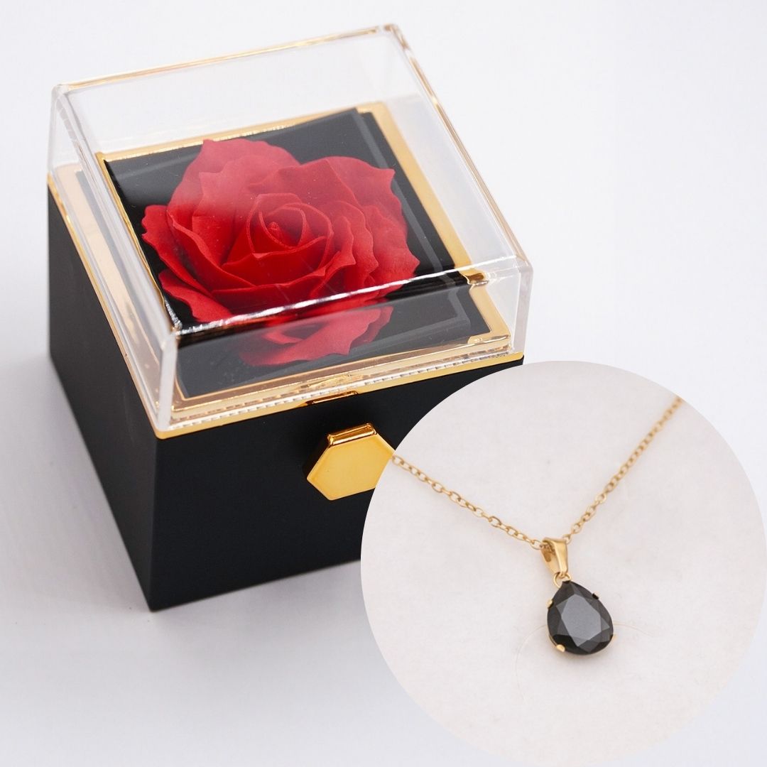 Dāvanu kastīte ar Mūžīgo rozi un kaklarotu Black - šī elegantā dāvanu kastīte apvieno luksusa dizainu un simbolisku nozīmi. Tajā atrodas Mūžīgā roze, kas simbolizē mūžīgu mīlestību un skaistumu, un smalka kaklarota, kas padarīs dāvanu īpaši personīgu. Ideāla Mīlestības dienas dāvana.