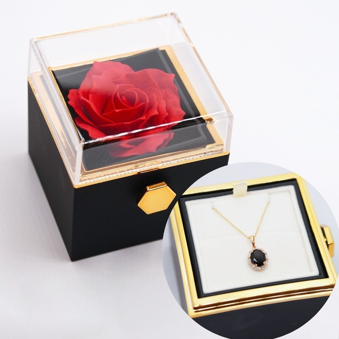 Dāvanu kastīte ar Mūžīgo rozi un kaklarotu - šī elegantā dāvanu kastīte apvieno luksusa dizainu un simbolisku nozīmi. Tajā atrodas Mūžīgā roze, kas simbolizē mūžīgu mīlestību un skaistumu, un smalka kaklarota, kas padarīs dāvanu īpaši personīgu. Ideāla Mīlestības dienas dāvana.