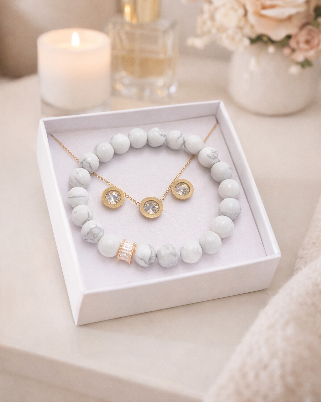 Elegants, skaists un ļoti gaumīgs komplekts- auskari, kaklarota un rokassprādze. Rotu komplekts lieliski piestāvēs tavām ikdienas gaitām, kā arī īpašiem mirkļiem.
