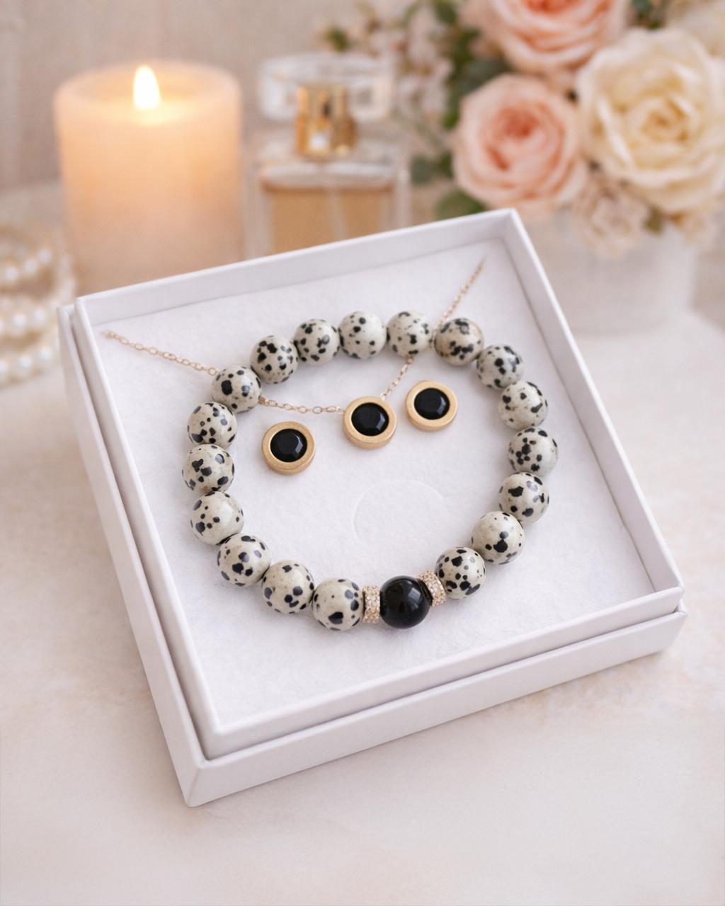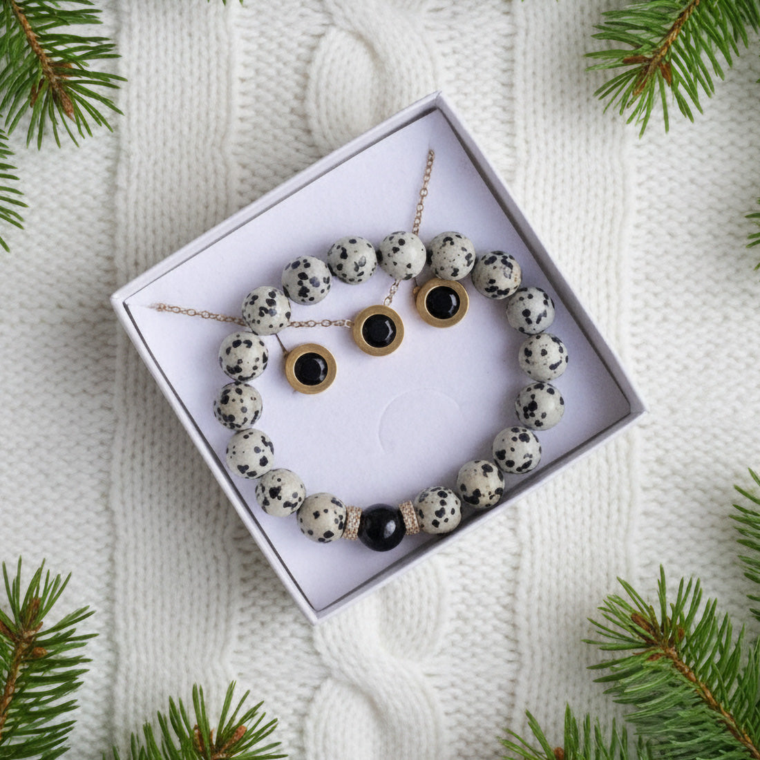 Elegants, skaists un ļoti gaumīgs komplekts - auskari, kaklarota un Dalmāciešu jašmas rokassprādze. Auskari ar kulonu lieliski piestāvēs tavām ikdienas gaitām, kā arī īpašiem mirkļiem.