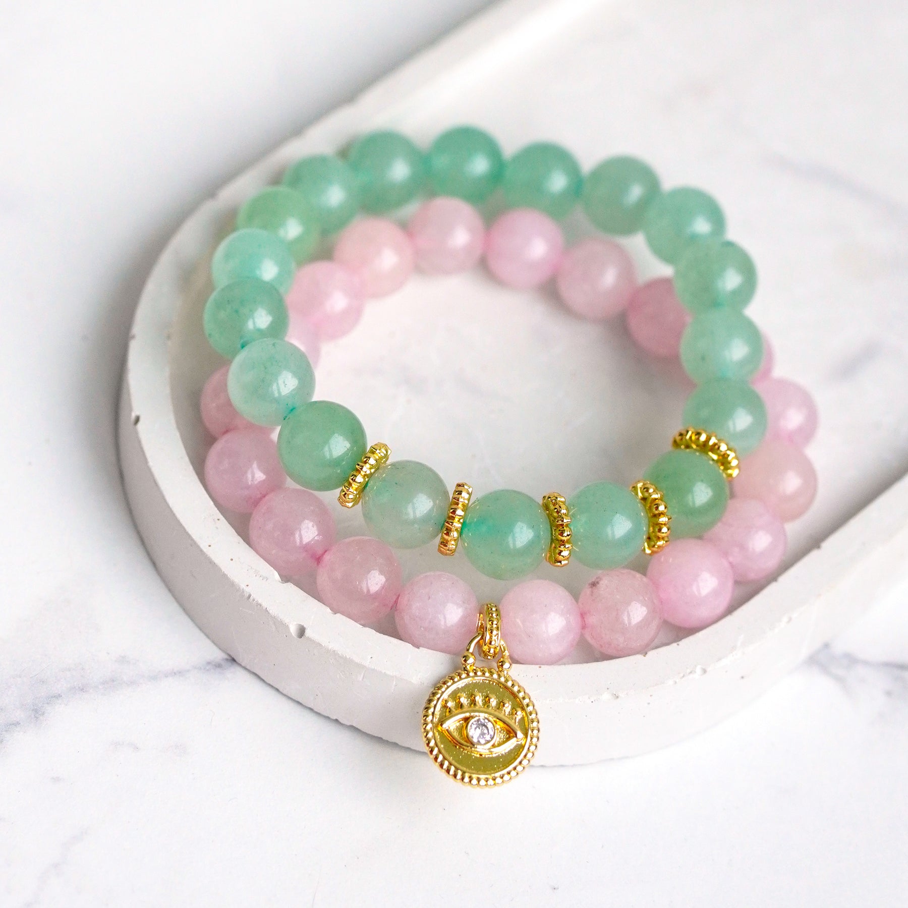 Rozā kvarca un avanturīna rokassprādzes naudas un mīlestības enerģijai
