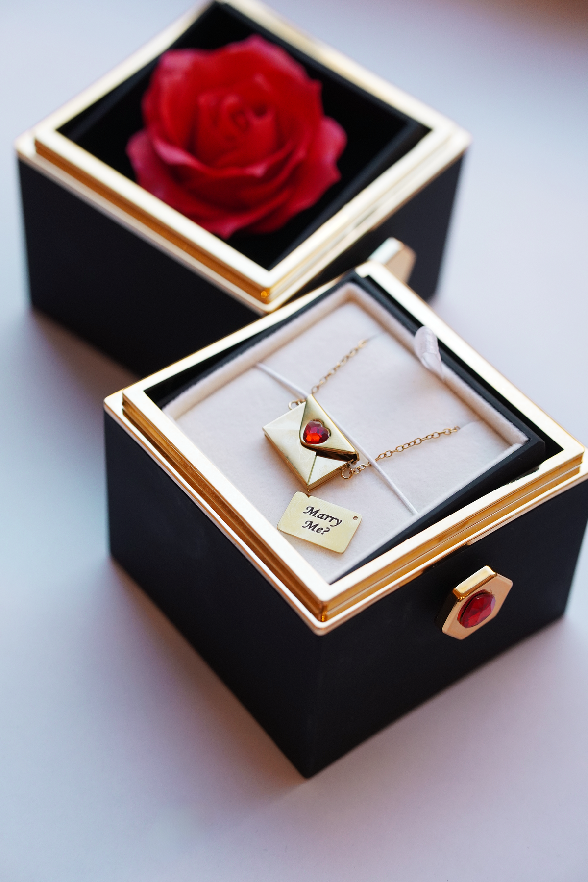 Dāvanu kastīte ar Mūžīgo rozi un kaklarotu - šī elegantā dāvanu kastīte apvieno luksusa dizainu un simbolisku nozīmi. Tajā atrodas Mūžīgā roze, kas simbolizē mūžīgu mīlestību un skaistumu, un smalka kaklarota, kas padarīs dāvanu īpaši personīgu. Ideāla Mīlestības dienas dāvana.