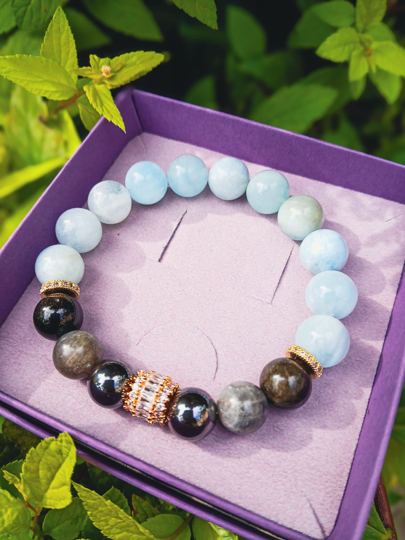 Šī dabīgo akmeņu rokassprādze apvieno labradorīta maģisko aizsardzību, hematīta spēku, obsidiāna enerģijas attīrīšanu un akvamarīna mieru.