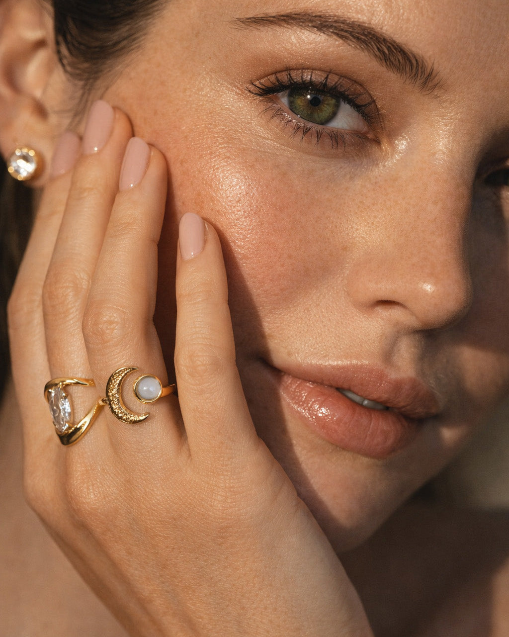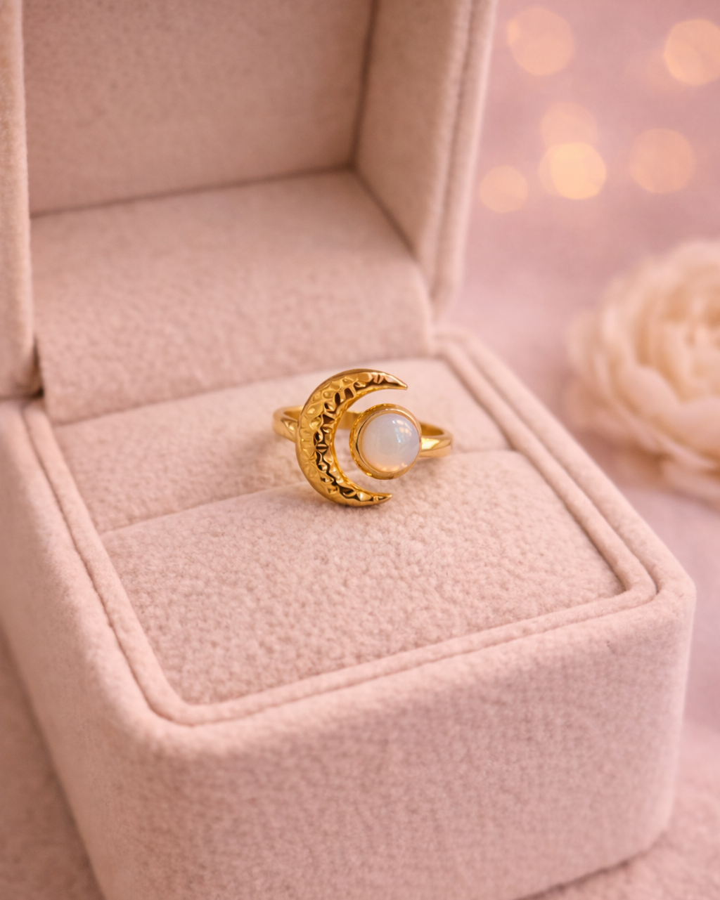 Šis zelta tonējuma gredzens ar izsmalcinātu pusmēness motīvu un maigu, pienaini mirdzošu akmeni centrā iemieso sievišķību un intuīcijas spēku. Pusmēness simbolizē jaunu sākumu, iekšējo līdzsvaru un maigu, bet spēcīgu enerģiju.