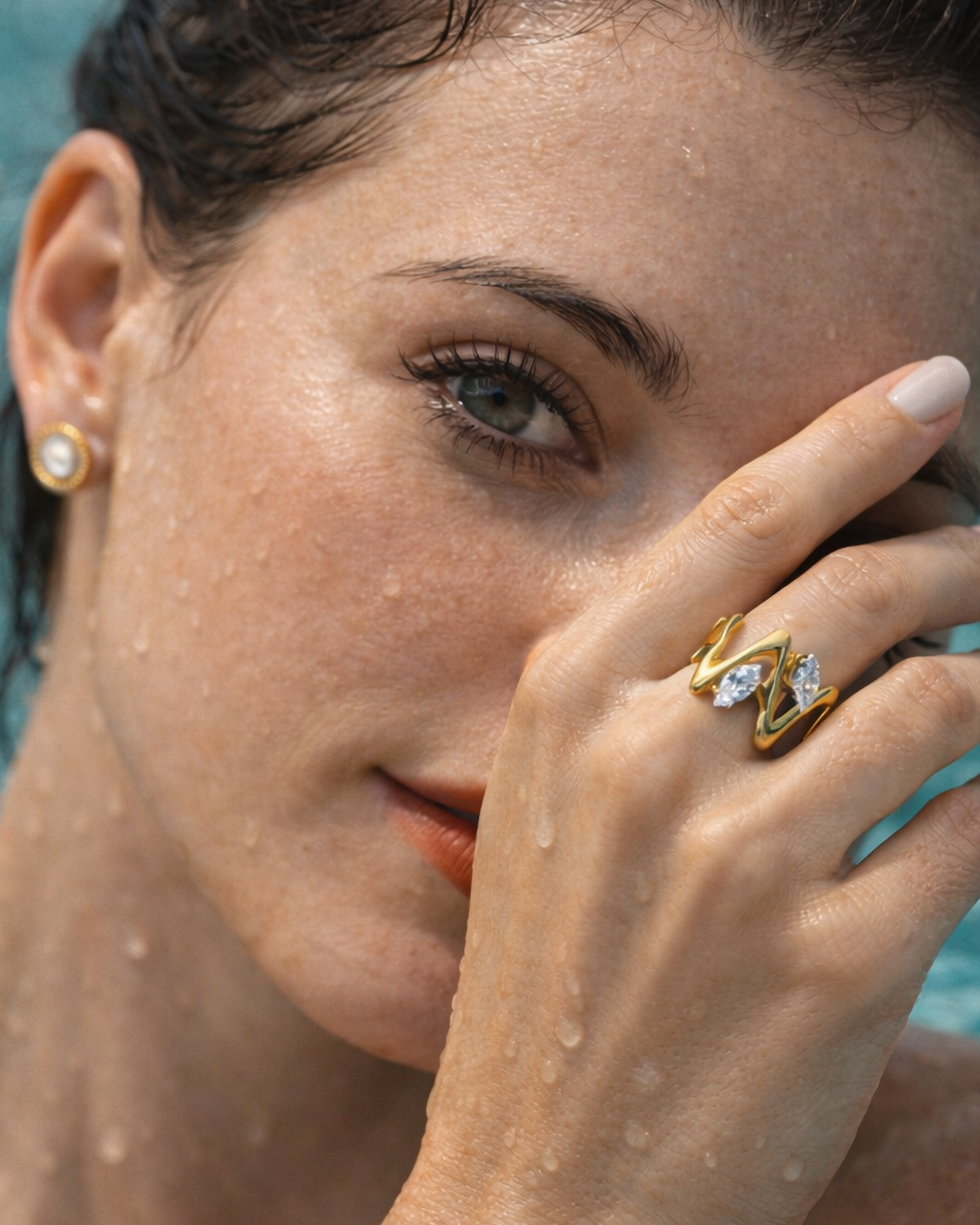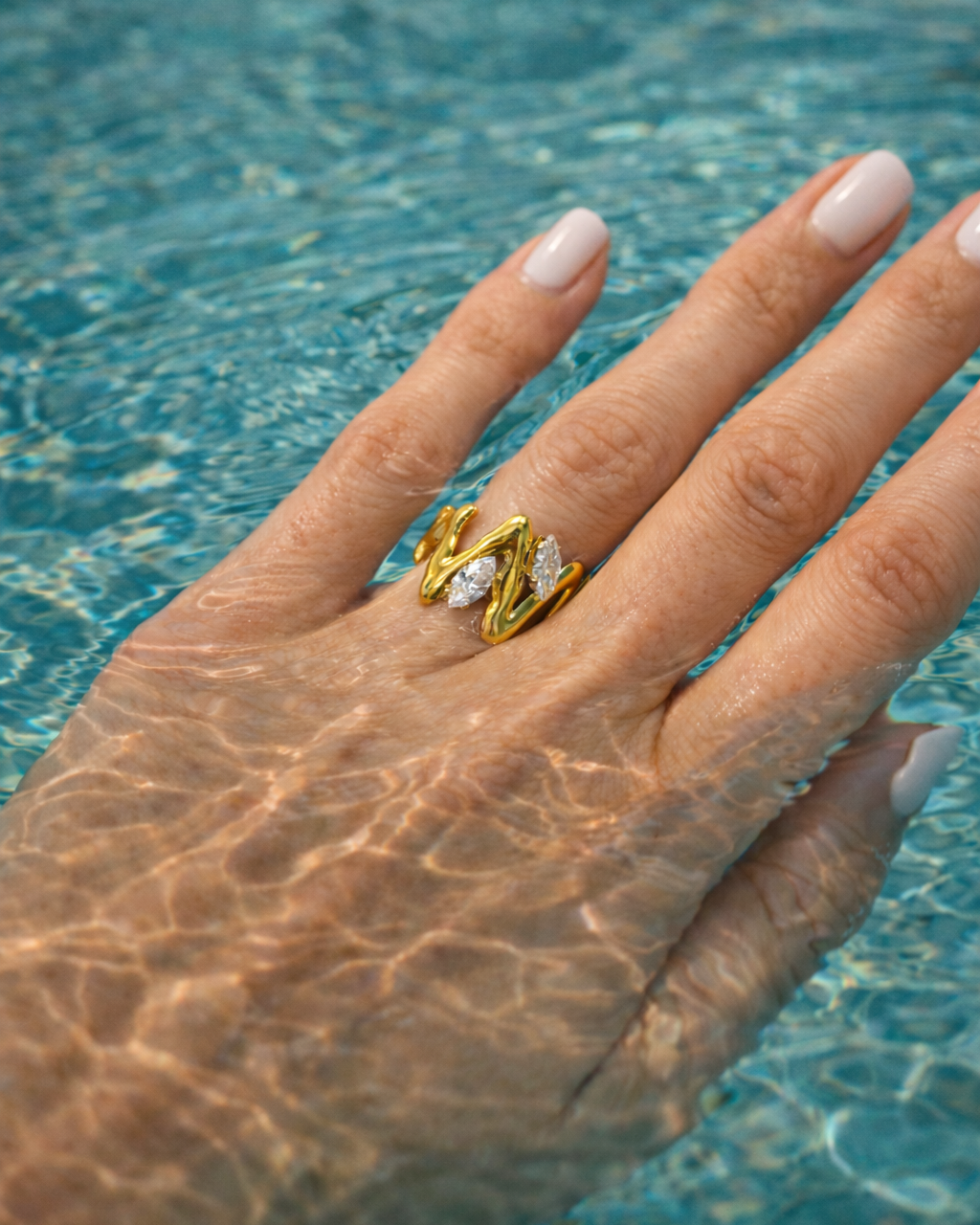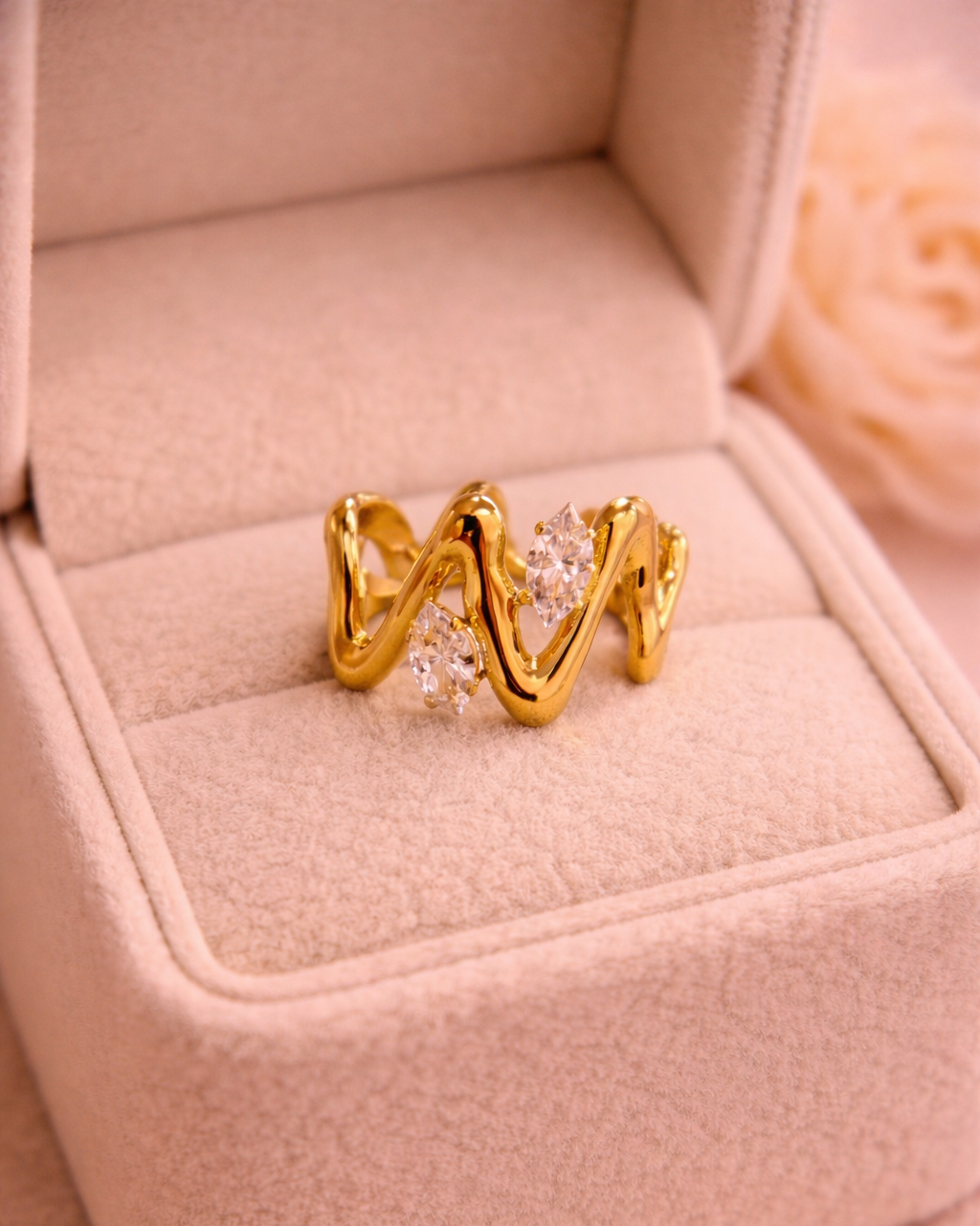 Plūstošas līnijas un mirdzoši akcenti – mūsdienīgs elegances un kustības simbols. Viļņveida zelta toņa forma maigi aptver pirkstu, radot dinamisku un izteiksmīgu siluetu, ko papildina divi dzirkstoši kristāli.