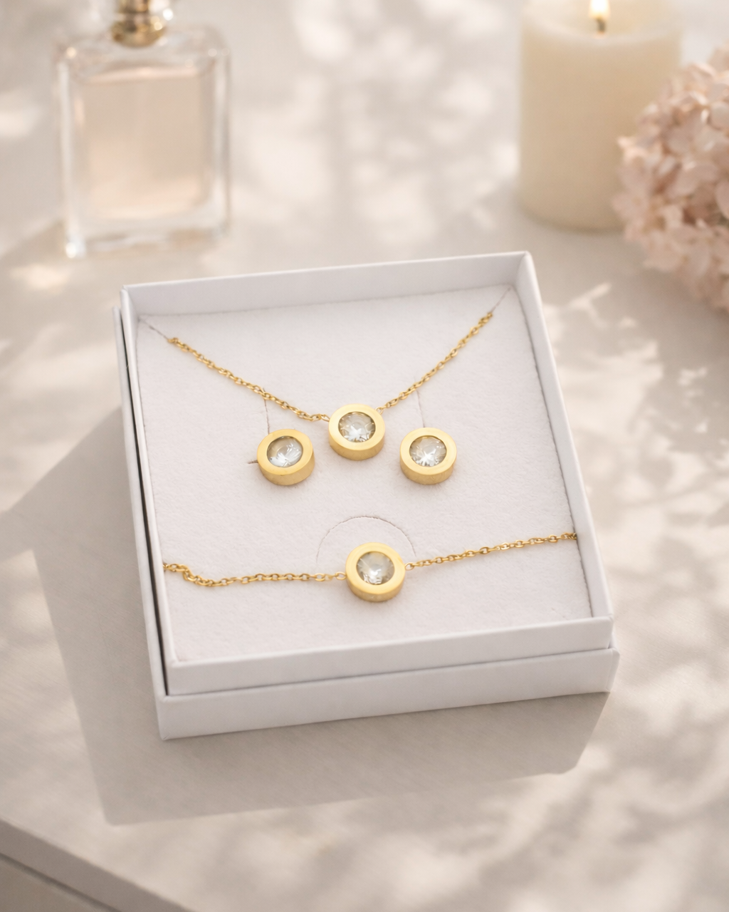 - Auskariem un kulonam ir ilgnoturīgs zelta pārklājums, kas saglabā savu krāsu saskarē ar ūdeni.