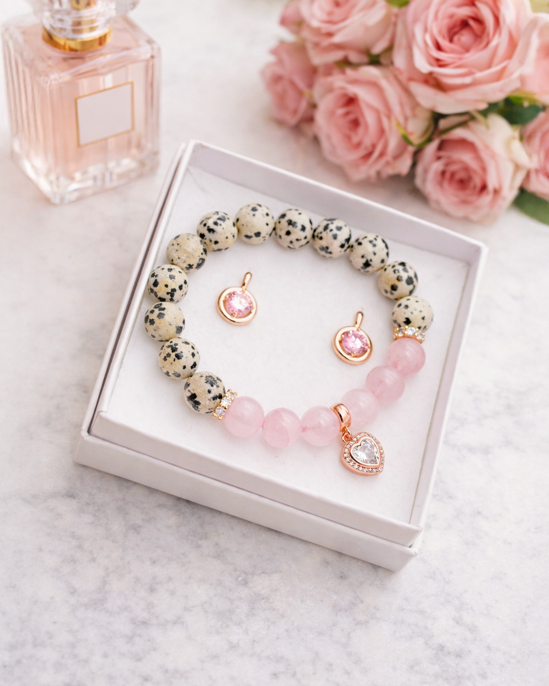 Rotu komplekts ar jašmas un rozā kvarca rokassprādzi Sirds Gaisma un auskari Pink moon